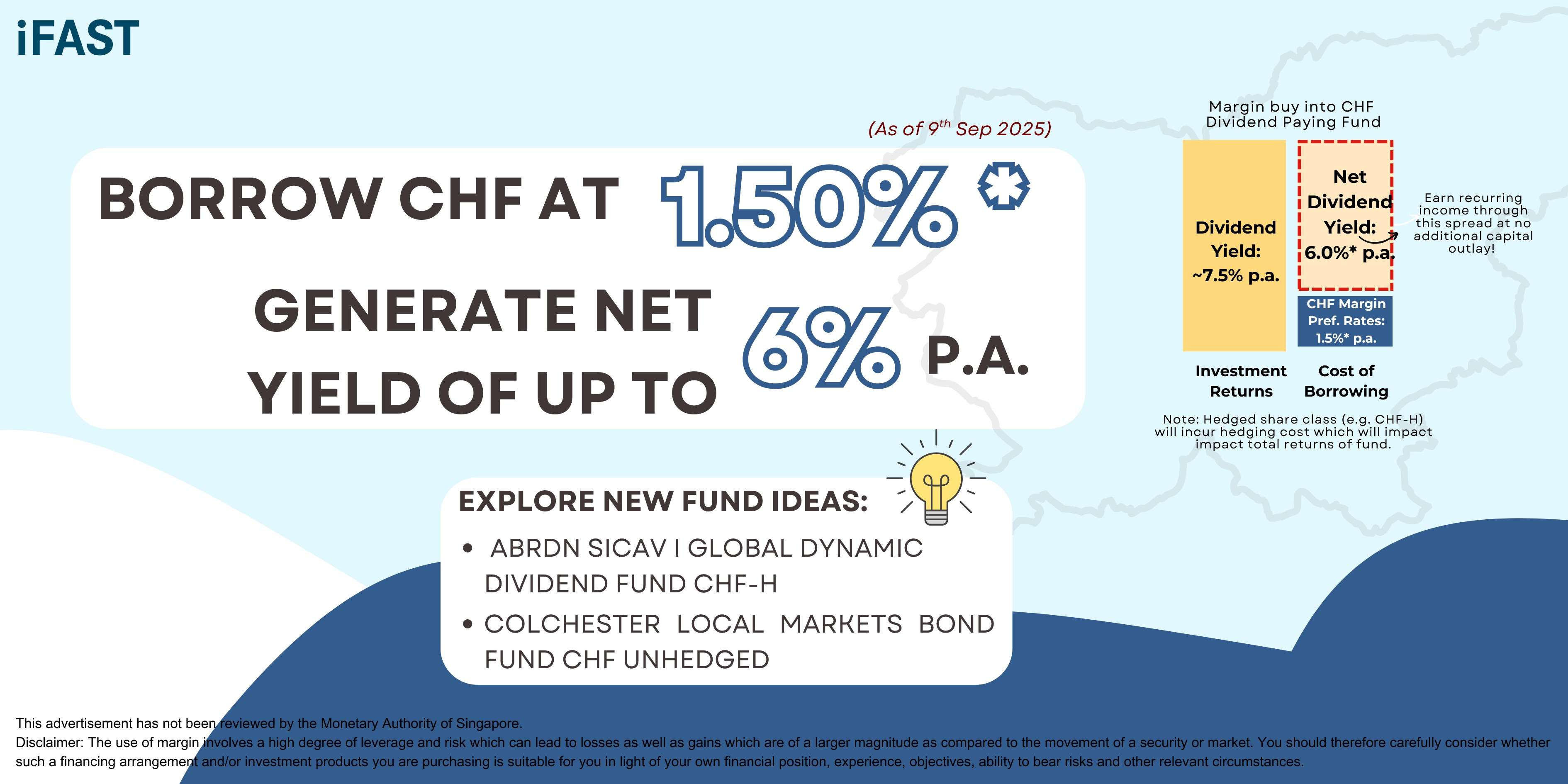 Interested in enrolling for iFAST Margin but not sure where to begin? Simply log in to iFAST App > Holdings > Margin Facility Enrolment > Opt in. Enjoy preferential CHF margin rate of just 1.50%, exclusively available to Accredited Investors who have completed a one-off product financing linkage (no minimum loan amount required).